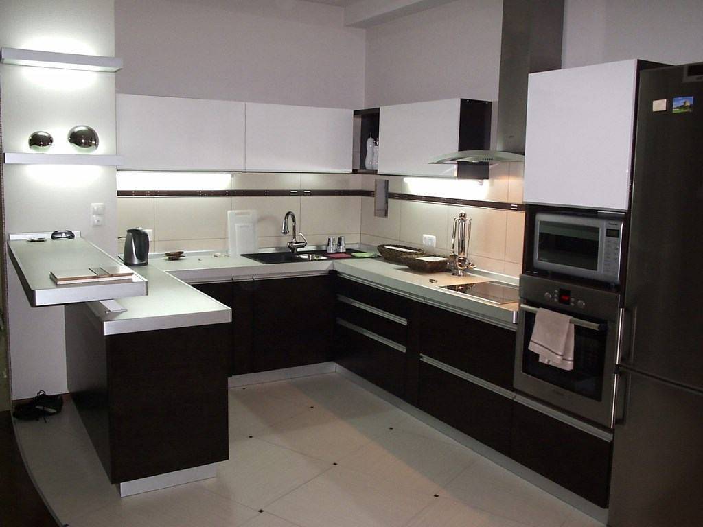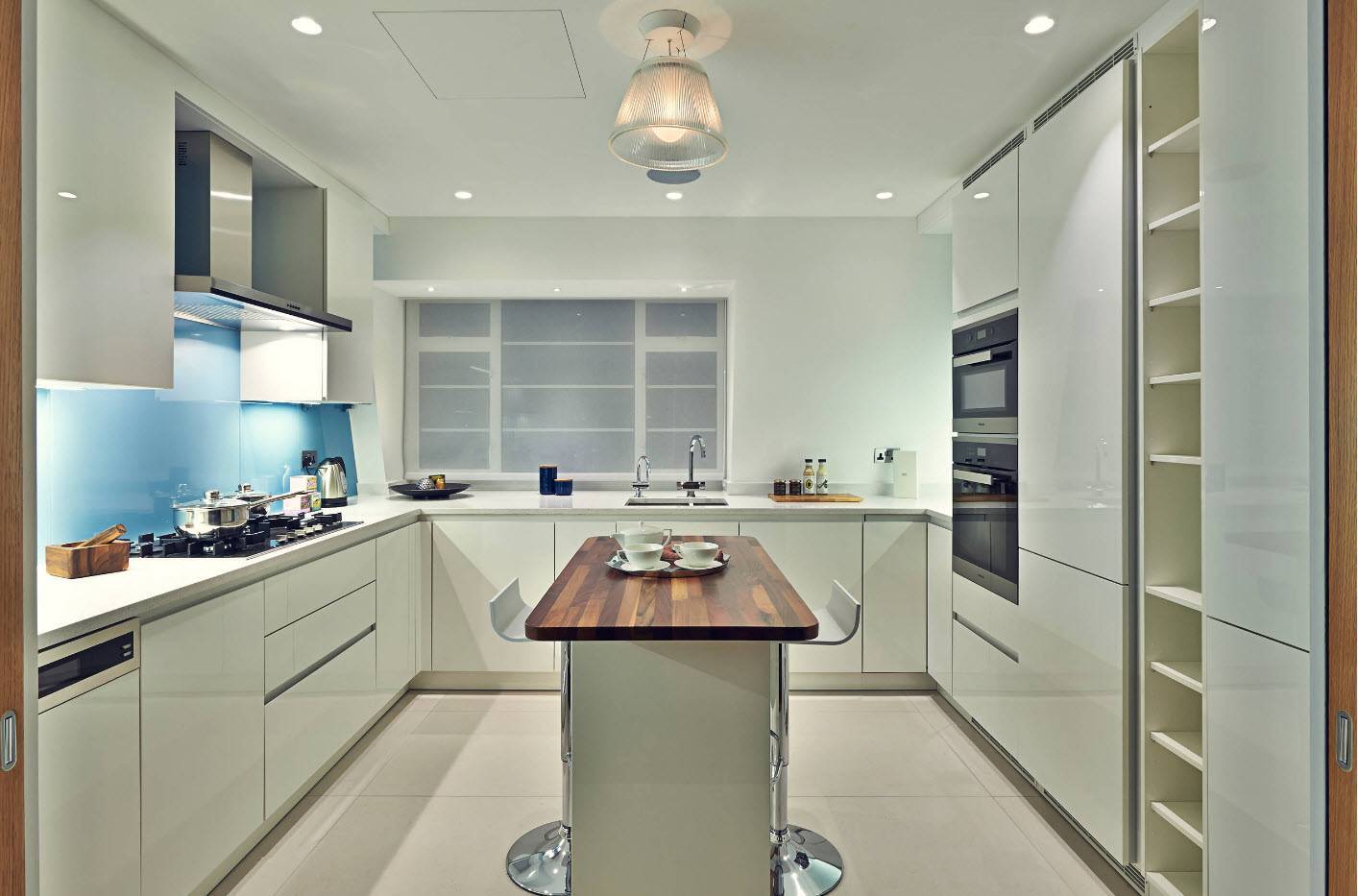 Вариант, где вся обстановка располагается вдоль трех стен, не оставляет места для обеденного стола. Такая расстановка мебели органично вписывается в совмещенное с гостиной помещение. Удобно она выглядит и в интерьере квартиры-студии. Границей между двумя ключевыми зонами может стать рабочий стол, совмещенный с барной стойкой со стороны гостиной.