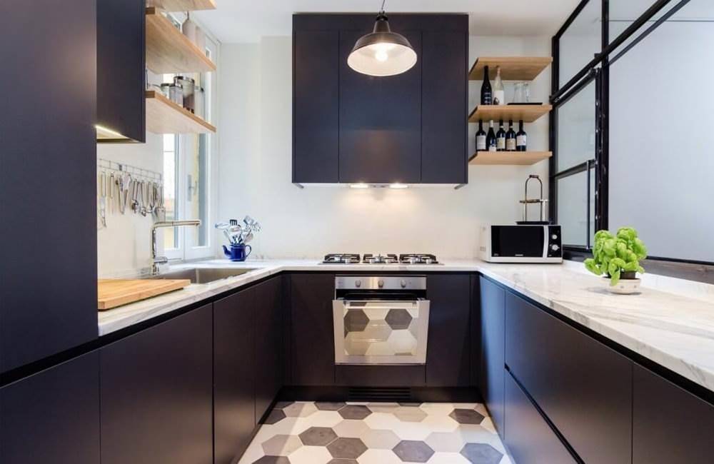 П-образный гарнитур в маленькой квартире подойдёт для людей, которые хотят использовать площадь на максимум. Эта планировка позволяет организовать вместительное хранилище, просторную рабочую зону и поставить всю необходимую технику. Стол в виде части гарнитура (на подоконнике/в качестве барной стойки) сэкономит место, если вынести его в другую комнату невозможно.