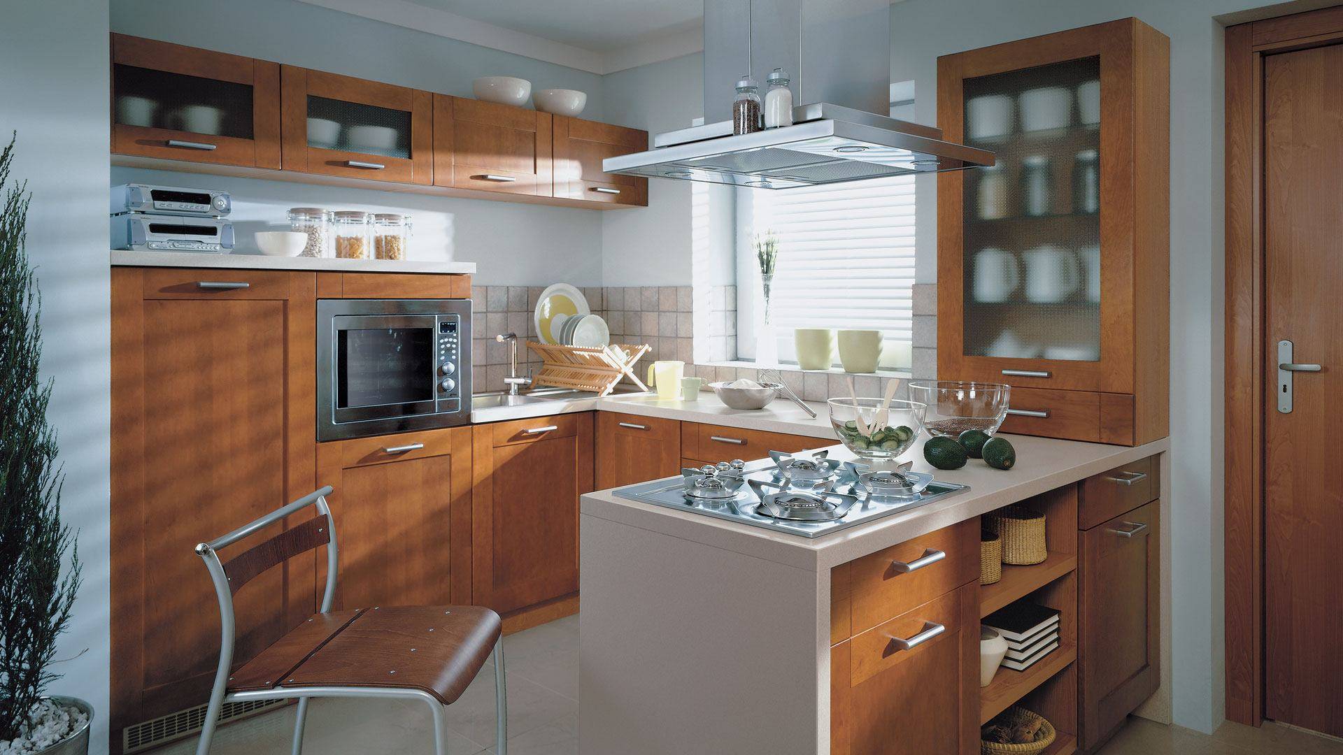 Однако, если вы не планируете оборудовать кухню островком (об этом мы расскажем позже в статье), то П-образный гарнитур следует оформить небольшого размера, чтобы проход между шкафами не превышать 120 см, иначе теряется преимущество П-образной компоновки.