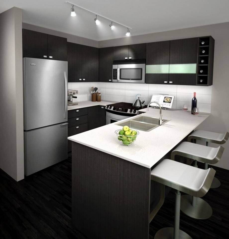 - П-образная кухня с барной стойкой может устанавливаться, если нет четвертой стены. Это лучший вариант для квартир-студий, где можно достичь функционального разграничения зон и при этом не делить и без того небольшое пространство.