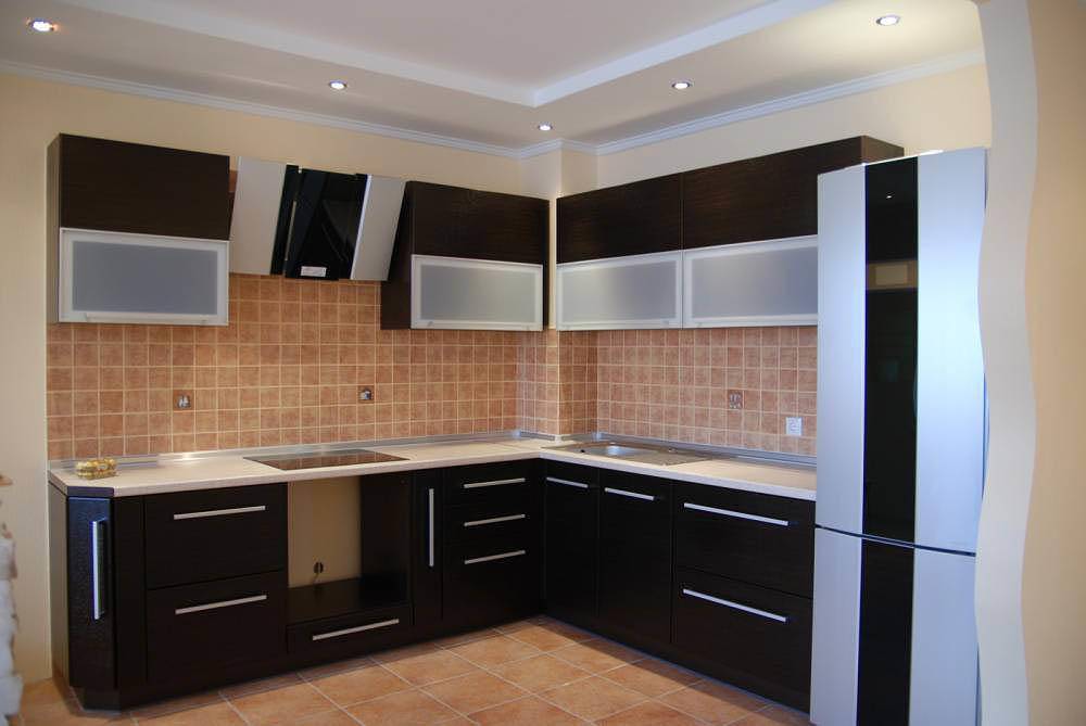 Если дверь на вашу кухню расположена в углу стены, то для такой кухни наиболее уместна угловая расстановка мебели, при этом раковину желательно разместить также в углу.