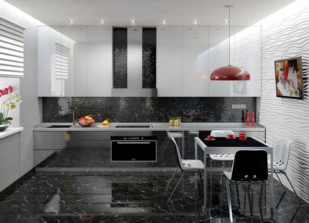 С помощью плитки можно создавать самые разные эффекты, например, выделять какую-то зону с помощью материала определенного цвета: декоративной плиткой можно выделить зону около плиты или мойки, а остальную часть выложить плиткой попроще. Стоит отметить, что в рельефной керамической плитке и в межплиточных швах может накапливаться грязь, поэтому лучше выбрать максимально гладкий материал, а швы сделать тонкими или же покрыть их лаком. При сочетании плитки над рабочей зоной и других видов отделки в остальных частях кухни лучше не останавливаться на одном цвете. Рабочую зону лучше цветом отделить от обеденной зоны в кухне, выполнив таким образом эффектное зонирование.