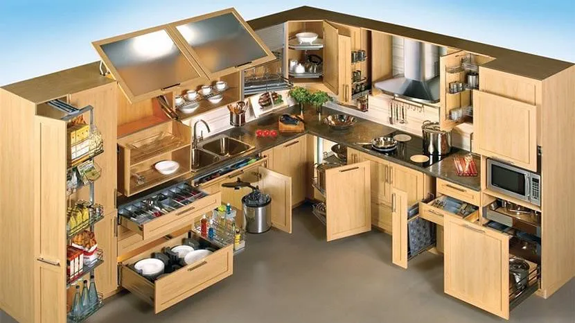 Не занимают места еще и двери-гармошки. Они удобны и долговечны, легко эксплуатируются и устанавливаются. Некоторые модели можно заказать индивидуально под арку. Для обустройства малогабаритной кухни используют Г-образную, линейную и реже угловую мебель. Последняя подходит даже для квадратных по форме помещений.