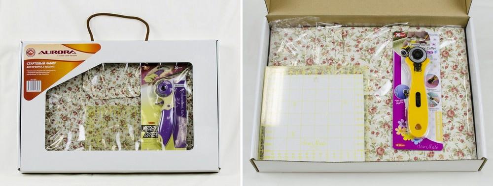 Набор для лоскутного шитья включает в себя ткани, необходимый инструмент, шаблоны и схемы блоков