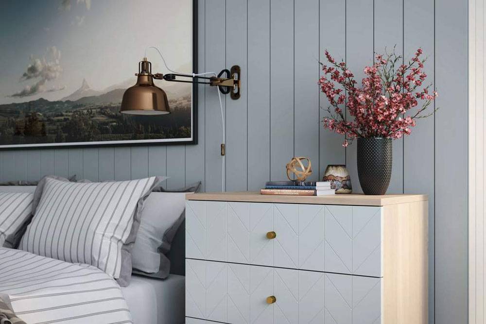 Краска глубокого синего цвета преображает фасад шкафа. Он сможет стать «главным героем» вашей спальни и задать направление в создании интерьера комнаты.