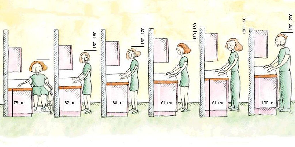 учитывается эргономика. Производители кухонь должны проектировать мебель в соответствии с личными параметрами тех, кто будет пользоваться кухней, как для высоких людей, так и для людей в инвалидных колясках.