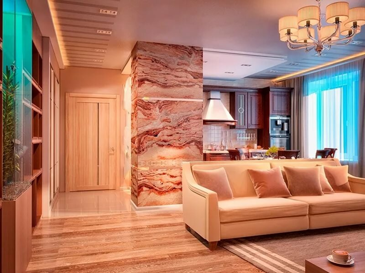 - Использование отделочных материалов «компаньонов», способных не только разделять помещение, но и соединить его функциональные зоны между собой.