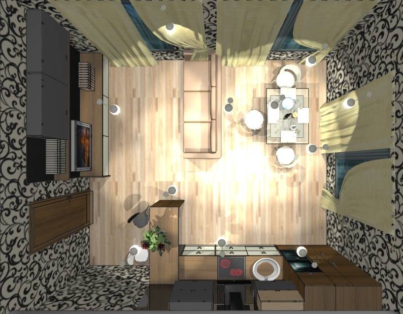 Яркий верхний свет обычно используют только во время готовки либо уборки, в остальное время используется функциональный и фоновый. Вешать на 1 выключатель верхний свет сразу над кухней и гостиной — ошибка т.к. он почти никогда не нужен там одновременно.