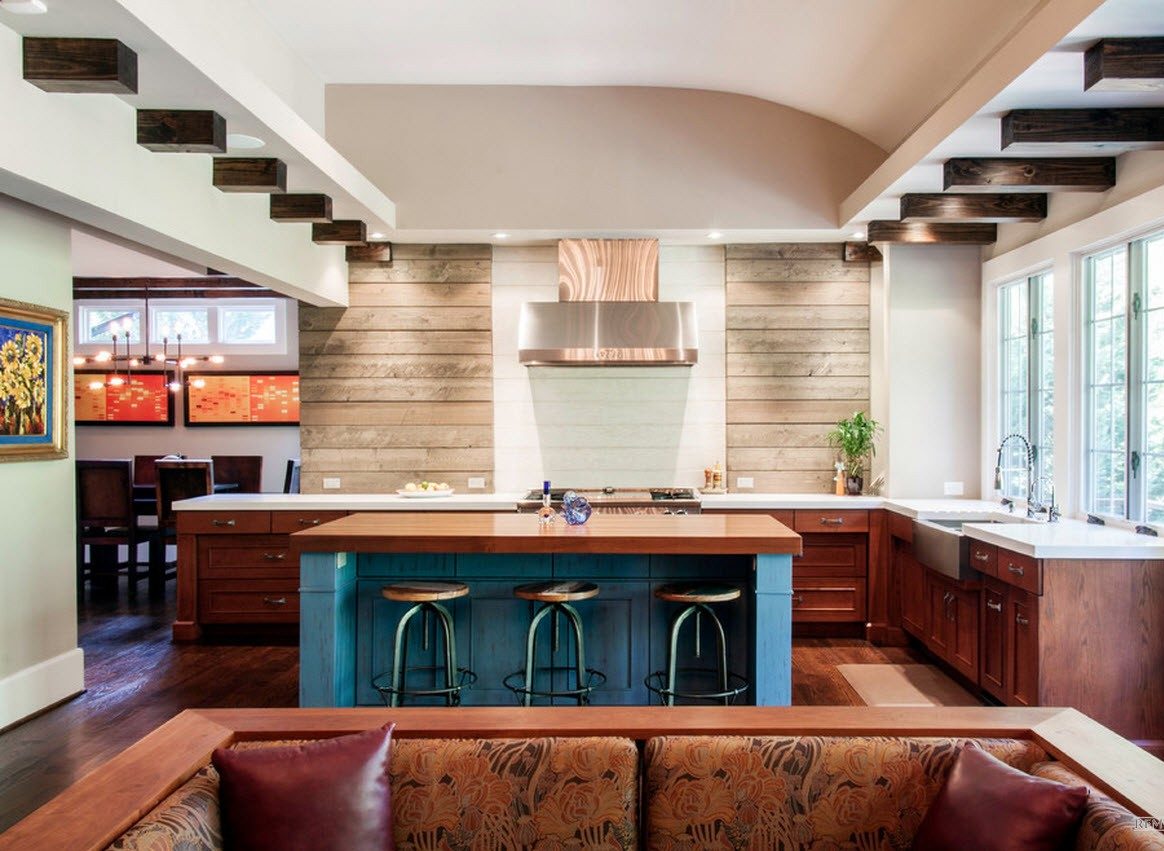 В доме применяются все те же способы отделения кухни от гостиной, что и в квартире. Что касается цвета, то стоит отталкиваться от того, из чего сделан дом. Если это кирпич, тогда цветовое решение разнообразно. Такой дом требует отделки, при которой могут использоваться разные материалы.