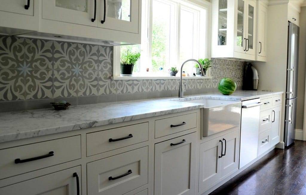 Часто цвет и фактуру отделки выбирают в тон столешницы или фасадов кухонного гарнитура, но также из этого типа отделки можно создать красивый орнамент, который преобразит дизайн и сделает его ярче.