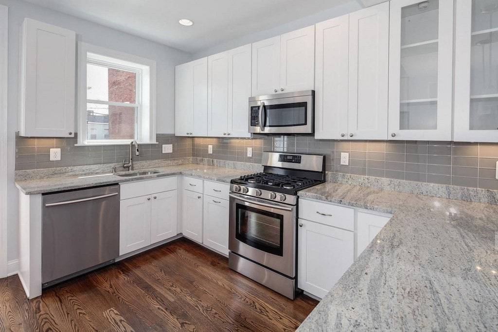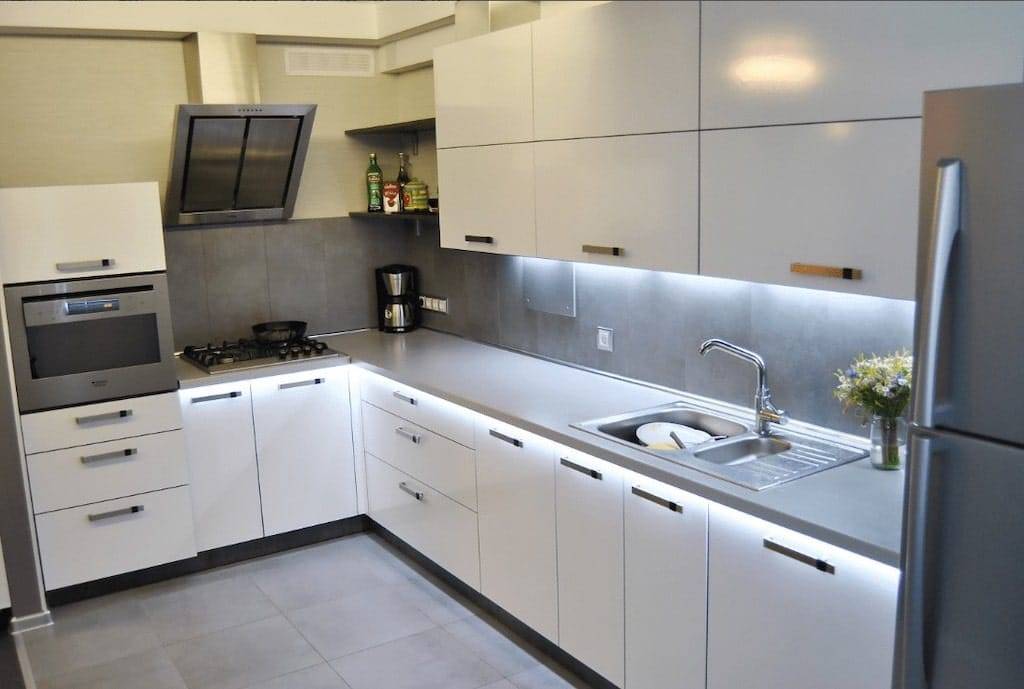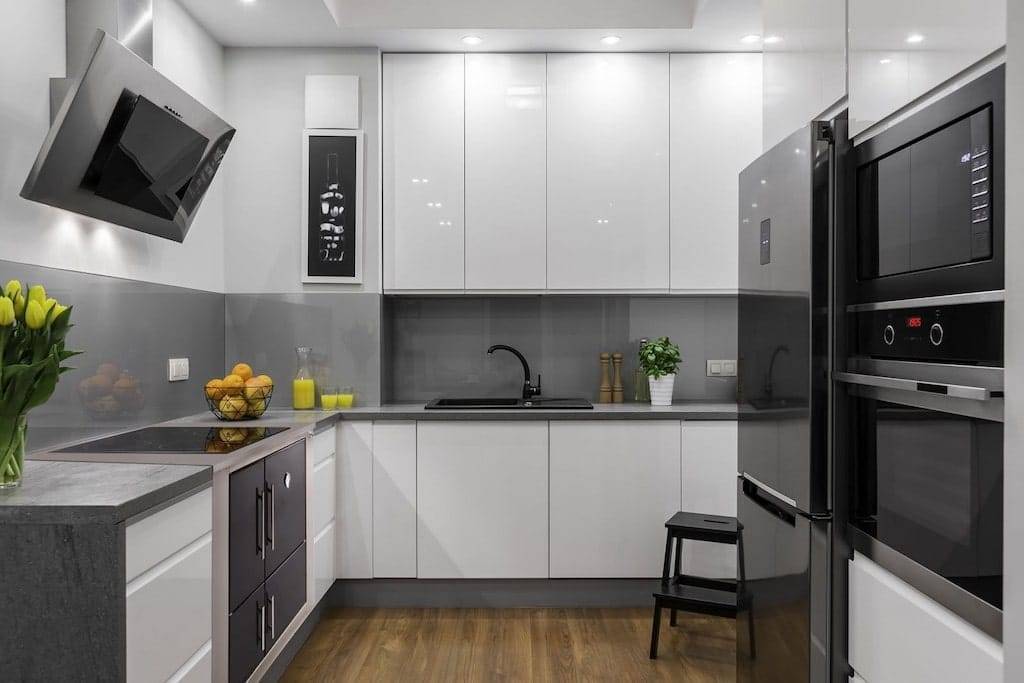 За счет белого оформления помещение кажется огромным и свободным. Используют мебельный гарнитур строгих линий и без лишнего декора. При помощи матовых и глянцевых поверхностей дизайнеры корректируют недостатки комнаты. Черная столешница в светлой кухне станет ярким пятном. В фасадах бытовой техники обыгрывают комбинацию основных цветов.