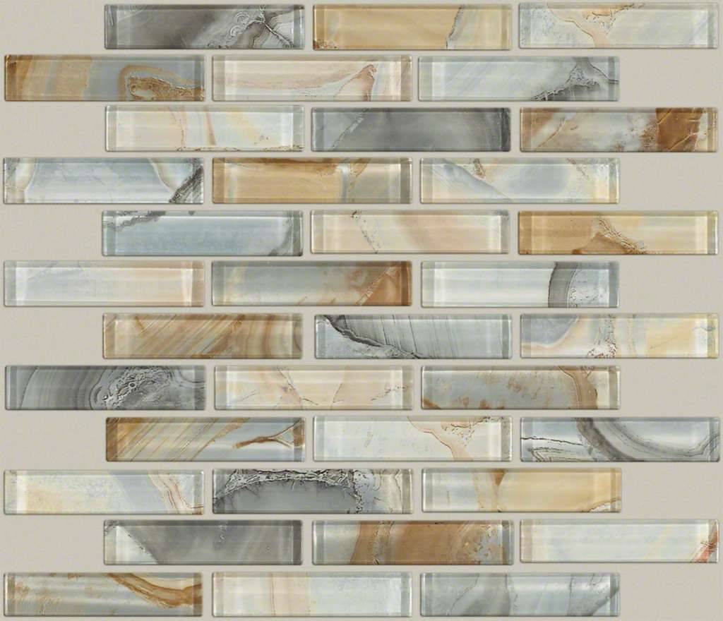 1. Глазурованная керамическая плитка. Не многие знают, что керамическая плитка, покрытая глазурью, имеет в своём составе стекло. Глазурь – это и есть перемолотое стекло с цветовыми добавками, которые раскаляют до высокой температуры и заливают поверхность керамической пластины слоем до 0,3 мм. Таким образом можно условно сказать, что поверхность глазурованной плитки стеклянная, именно поэтому эти материалы так близки. Некоторые фабрики выпускают плитки, стилизованные под стеклянные. Например, у фабрики Kerama Marazzi есть коллекция Мурано, которая имитирует муранское (венецианское) стекло.