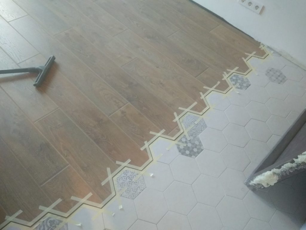 Если плитка и ламинат располагаются на одной высоте и зазор между ними минимальный, вместо использования специальных прослоек и порожков можно попытаться затереть место соединения с помощью специального состава. Метод стык в стык позволяют реализовать: