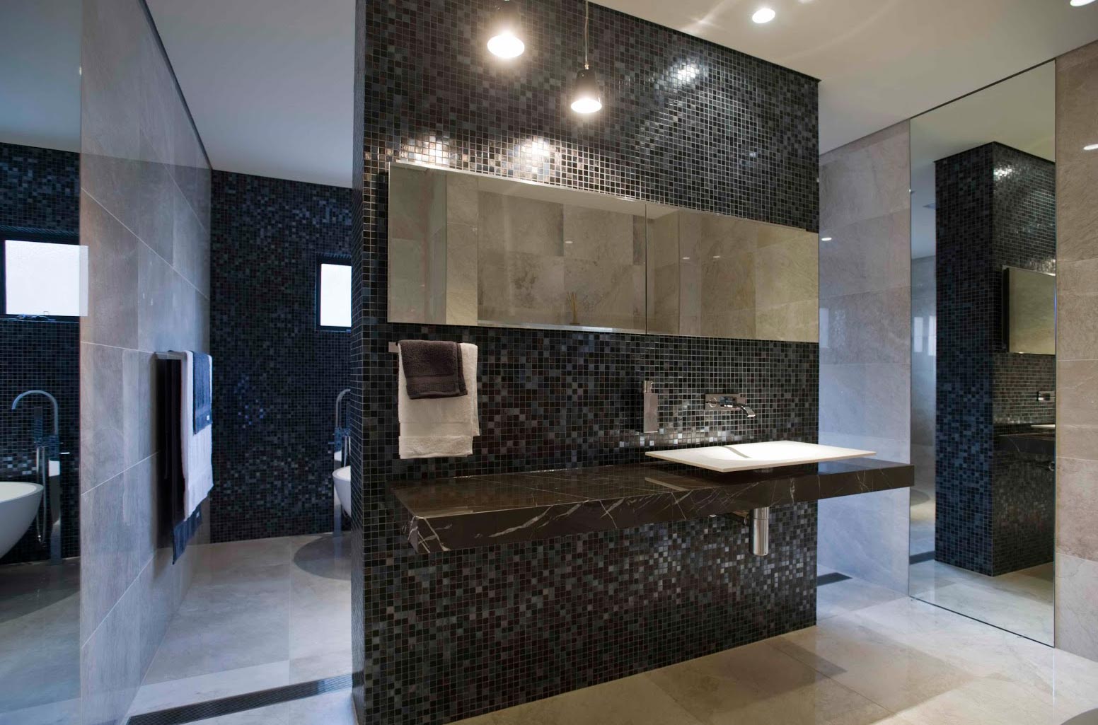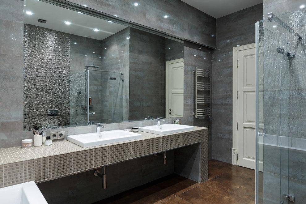 При помощи мозаики просторную ванную разделите на функциональные зоны: душевую, раковину, туалет. Для оформления подойдёт глянцевое покрытие. Тёмные оттенки лучше оставить для облицовки деталей.