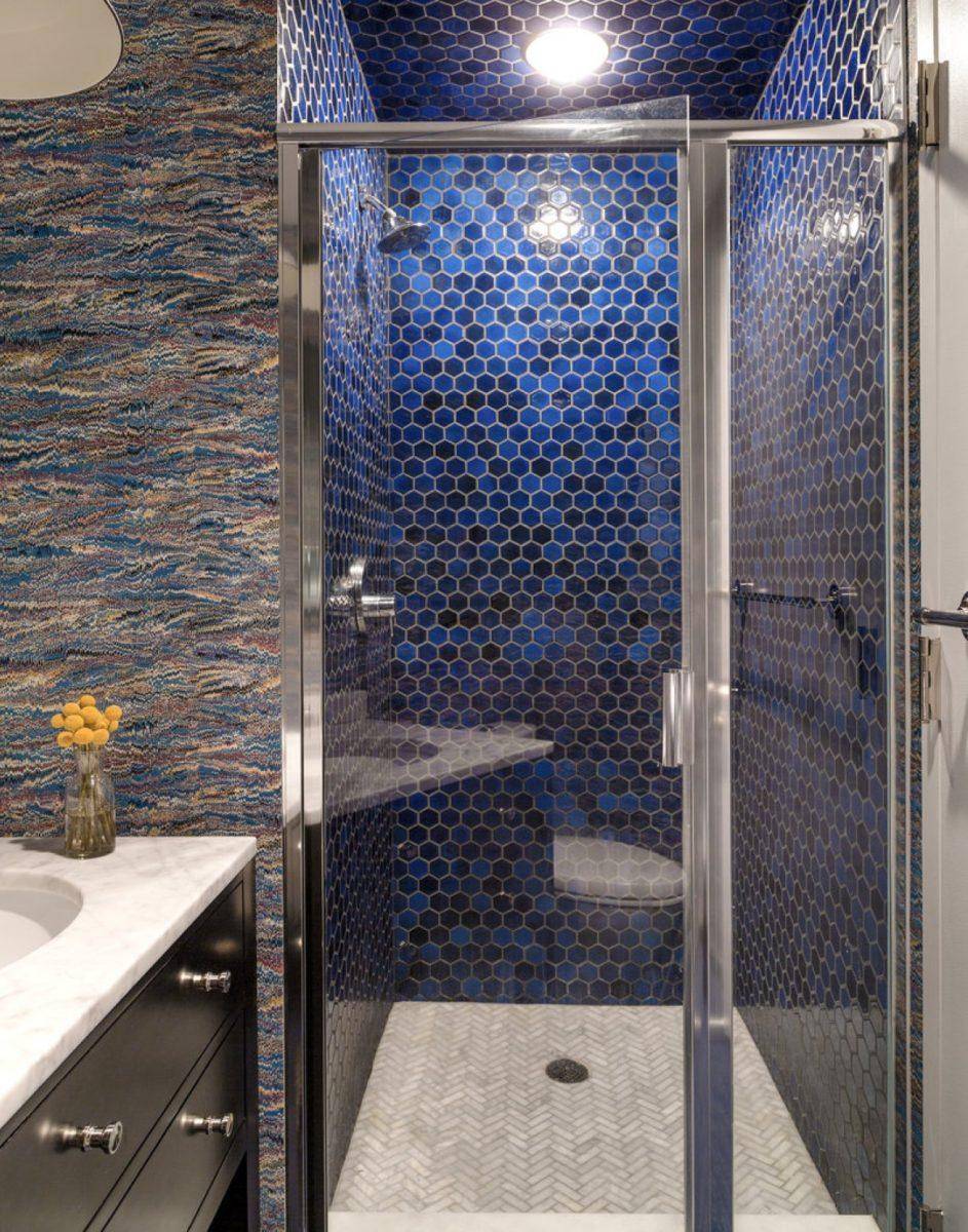 Если в ванной комнате устанавливается неготовая душевая кабина, а отгораживается перегородками душевая зона, она эффектно будет смотреться, если оформить ее мелкой мозаикой. Дизайн может быть различным, часто используют монохромный вариант светлых оттенков – голубой, бежевый, светло-зеленый.
