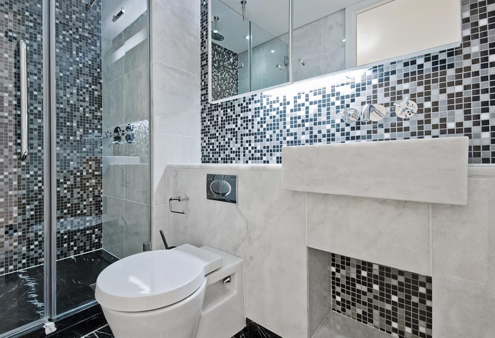 В ванной комнате плитку-мозаику применяют для отделки различных поверхностей.