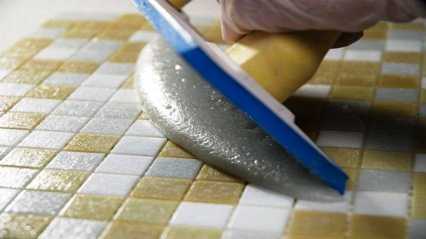 Для затирки рекомендуют использовать двухкомпонентные смеси, выбранные по типу мозаичной плитки, поскольку существует различие между смесями для керамических и стеклянных материалов. Затирочную смесь разводят водой в пропорции, что указаны в инструкции. Если затирается мозаика для ванной смеси дополнительно должны обладать противогрибковыми свойствами.