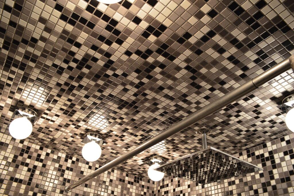 Отделка потолка мозаикой требует от исполнителя высокого профессионализма, но с её помощью ванная комната приобретает исключительный вид.