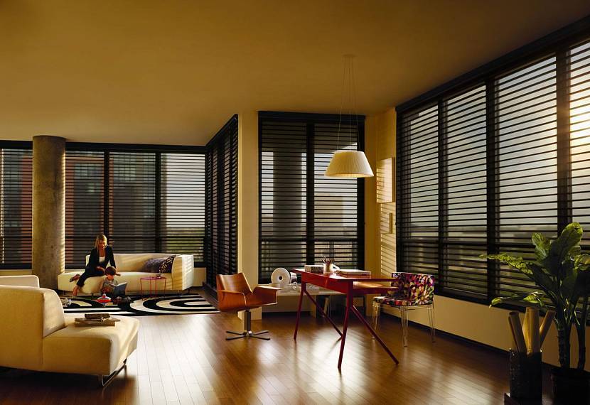 Объёмные окна и горизонтальные жалюзиИсточник idealdesigner.ru