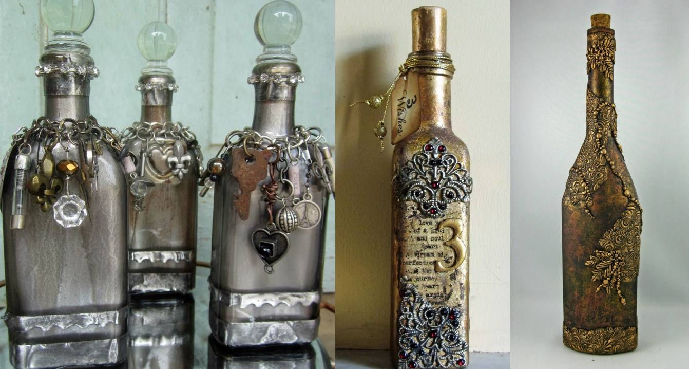 Декорированные бутылки часто используются для интерьера, созданного с уклоном на какую-то конкретную тематику или стиль. Как красиво не была бы оформлена бутылка, в первую очередь она должна подходить по стилю. Для уютной гостиной с камином, оформленной с уклоном на уютную осеннюю тематику, стоит выбрать баночки с декоративным консервированием, окрашенные в теплые тона (бордовый, оранжевый, кирпичный) с элементами из грубой нити, сухоцветов или круп.