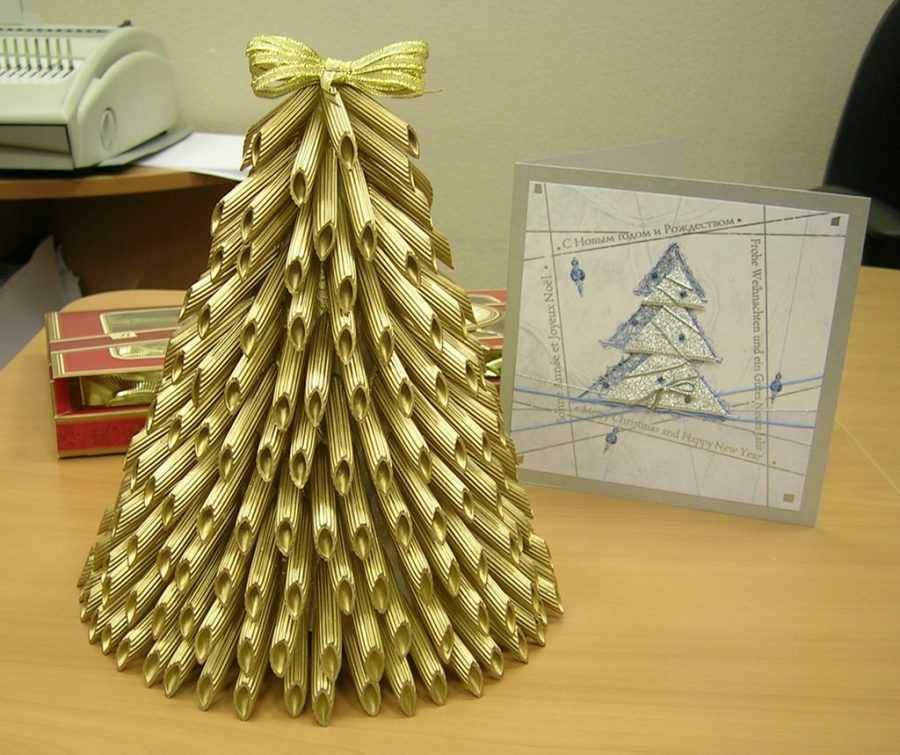 Более простым вариантом будет картонный конус, не нуждающийся в дополнительной обработке. Отличными еловыми лапами станут перья или бантики, которые нужно наклеивать ровными рядами, с чередованием и внахлест.