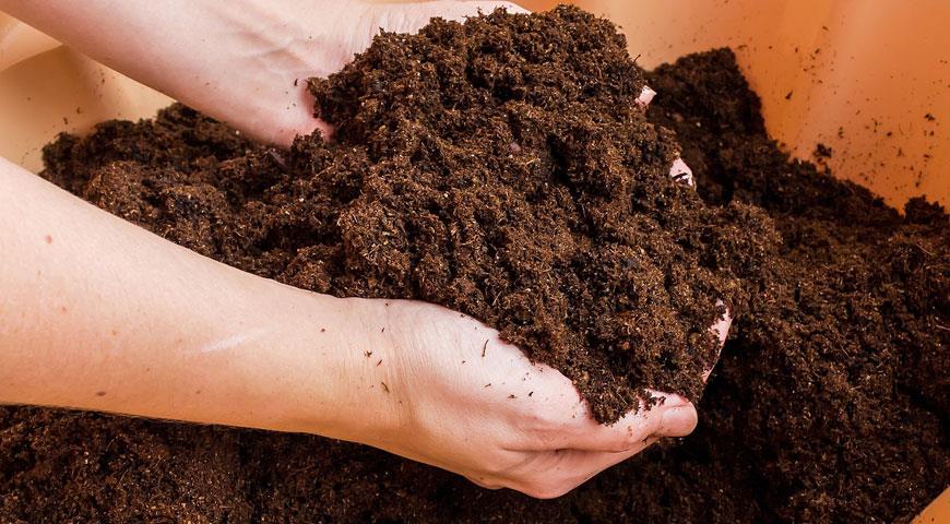 Подготавливают почвосмесь: берут торф, дерновую землю, перегной или хорошо перепревший компост и крупнозернистый песок в соотношении 4:3:2:1. Добавляют 2–3 кг древесной золы. Грунт тщательно перемешивают.