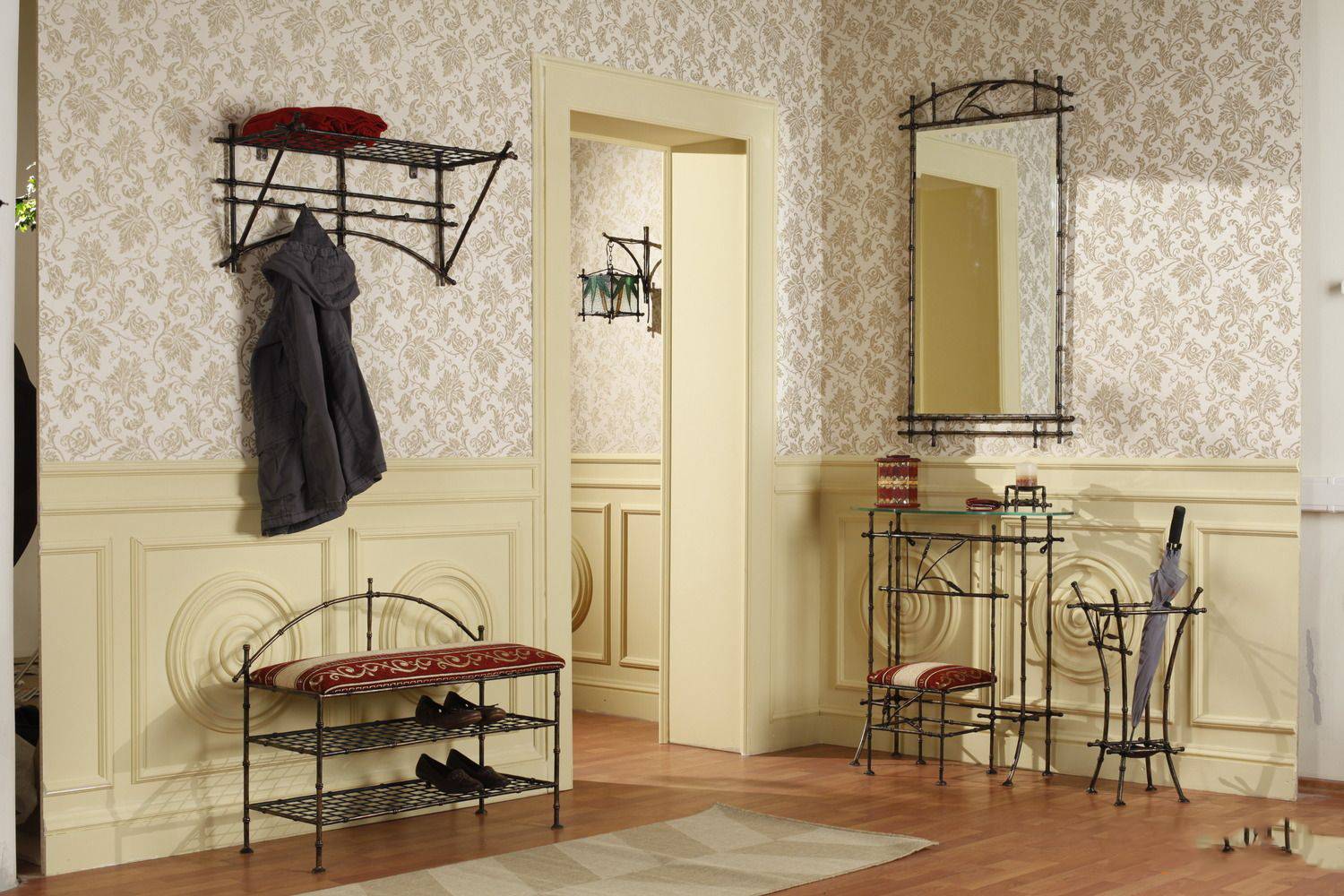 Натуральное дерево придает помещению уют. Оно великолепно сочетается со шкафами, гардеробом, тумбами и кушетками из дуба бука, ольхи или хвойных пород. В классические интерьеры можно поместить зонтовницы с чеканкой или резные изделия.