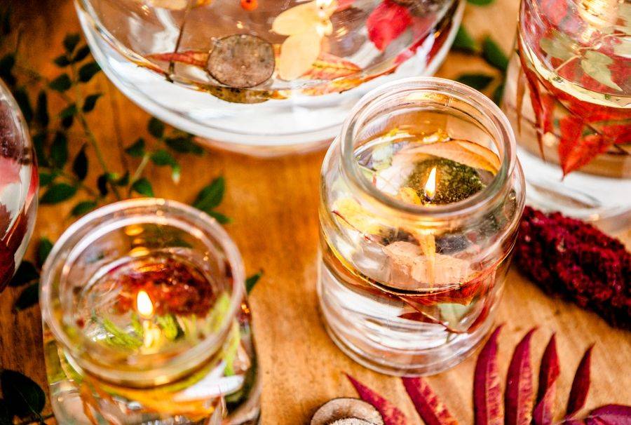 Желтые опавшие листья в подсвечнике помогут сохранить воспоминания о чудесной осени: