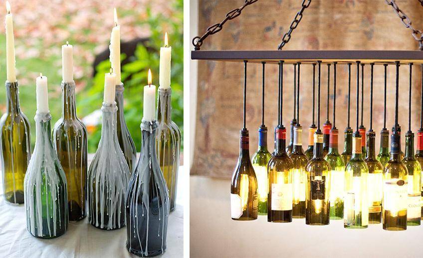 Красивыми и элегантными получатся декоративные элементы из бутылки из стекла. Они оригинально впишутся в интерьер в винтажном стиле. Чтобы соорудить подсвечник, можно срезать верхнюю часть, и наполнить вторую половину воском. Не забудьте вставить фитиль или небольшую свечку.