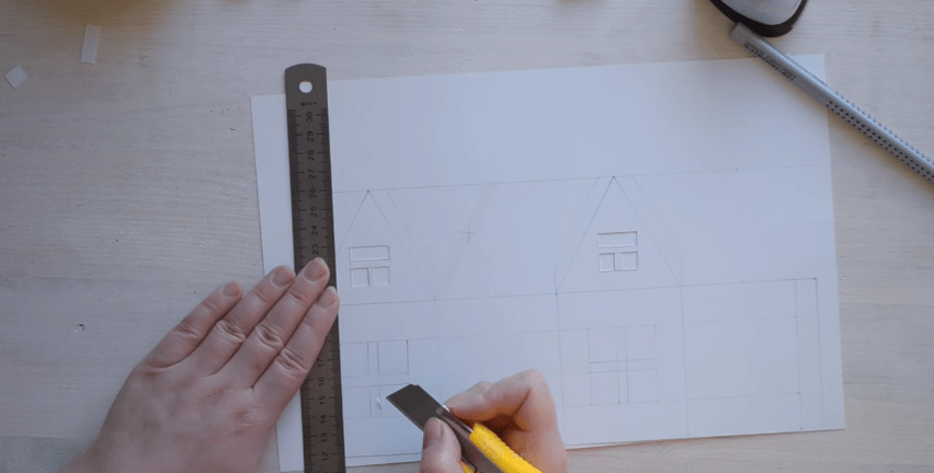 1 Нарисуйте на картоне шаблон домика, и вырежьте его.