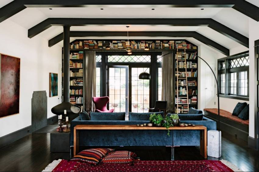 - Балочные потолки — добавят гостиной элегантности и стиля. Обычно балки делают из дерева, но допустимы и другие материалы;