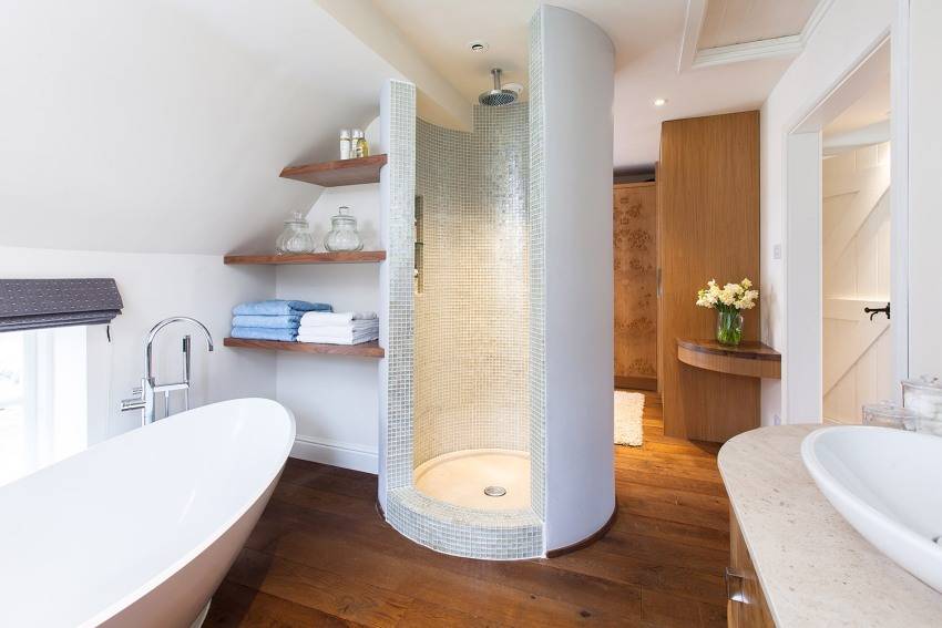 Стены ванной в мансардном помещение окрашены белой водостойкой краской