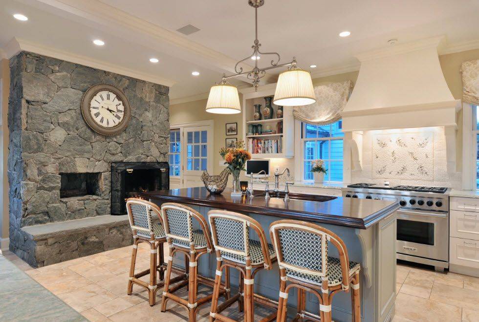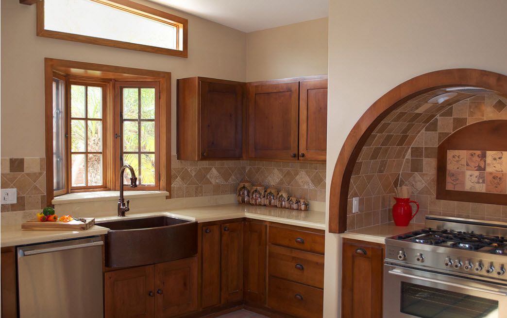 В условиях загородного дома пространство кухни и меньший уровень “вычурности” позволяют безболезненно использовать камень, доски, балки, плитку, кирпич и т.п. Главное не переборщить и не превратить кухню в что-то среднее между прихожей и гаражом.
