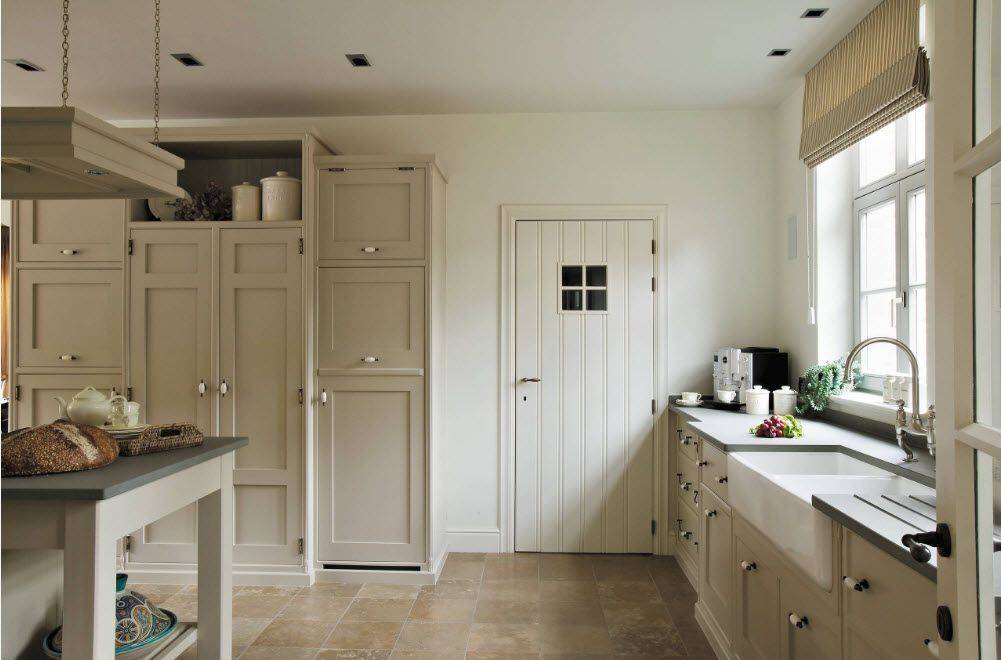При выборе мебельного гарнитура преимущество остается на стороне натуральных материалов. Идеальным вариантом считаются такие деревья, как классический дуб, бук или более дешевый вариант – сосна. При ограниченном бюджете уместно использовать фасады из крашеного МДФ. Клееный ДСП применяют только в крайнем случае. К элементам, подчеркивающим аутентичность стиля, относят: