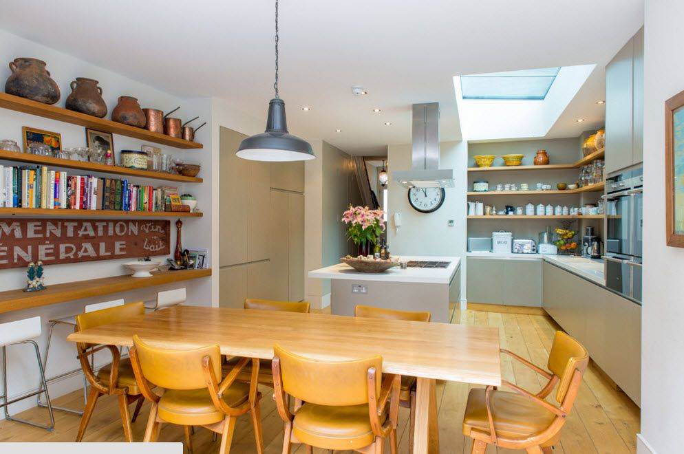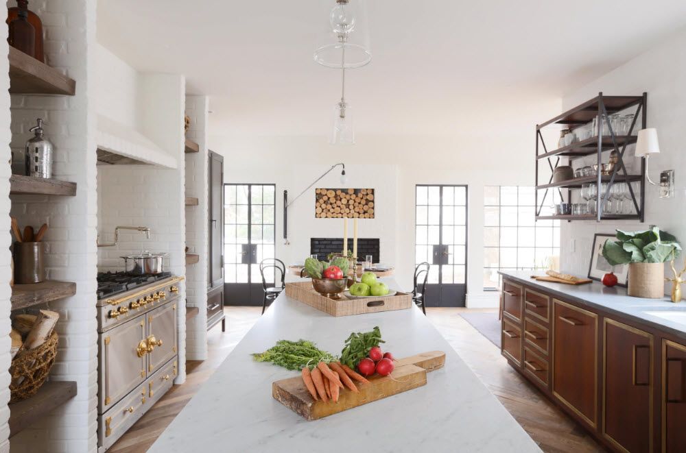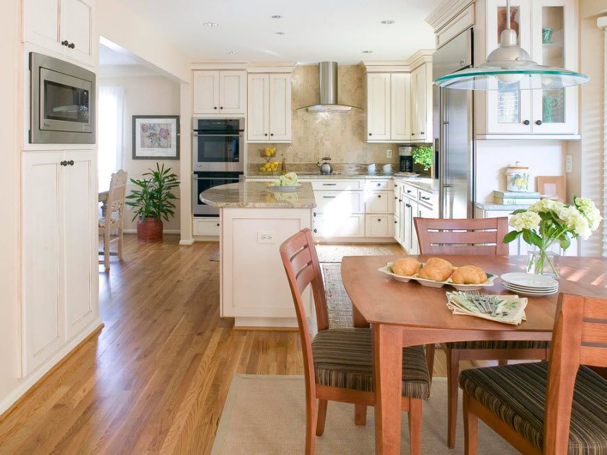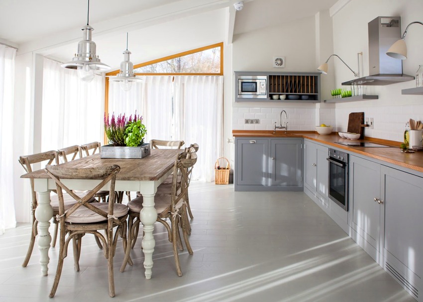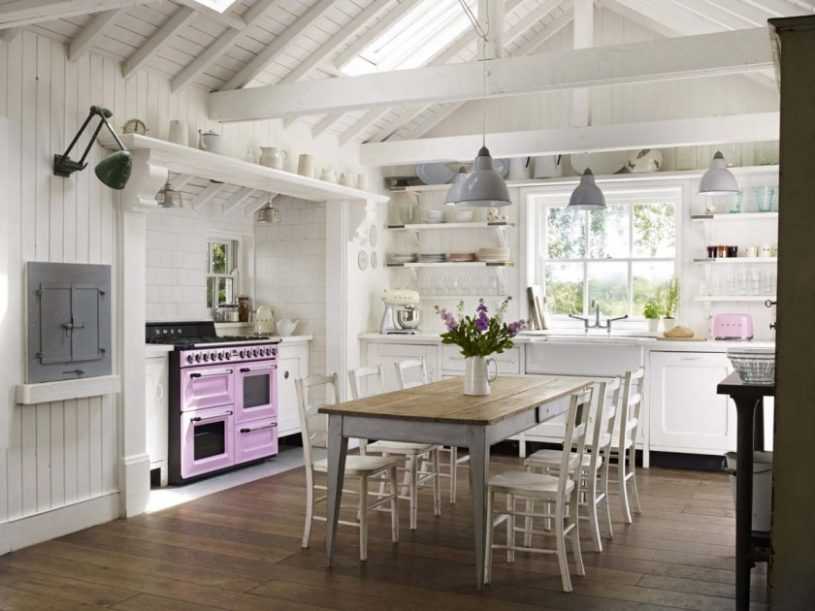 Этот стиль одинаково хорошо подходит для оформления как небольших кухонь в квартирах, так и просторных помещений загородных домов. Поскольку он предполагает использование светлых тонов, с его помощью можно визуально расширить комнату.