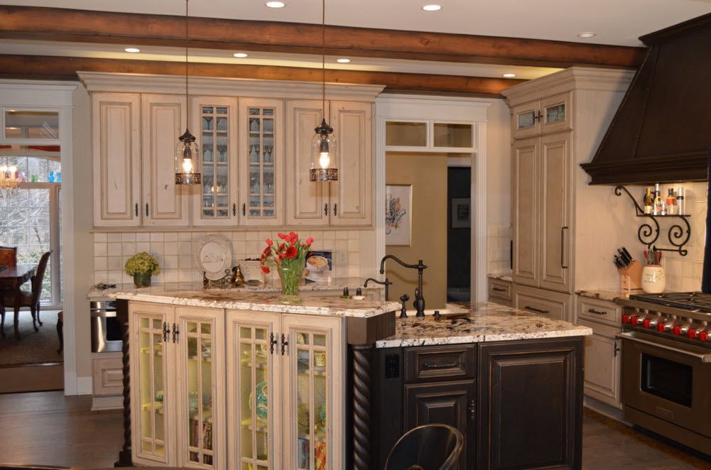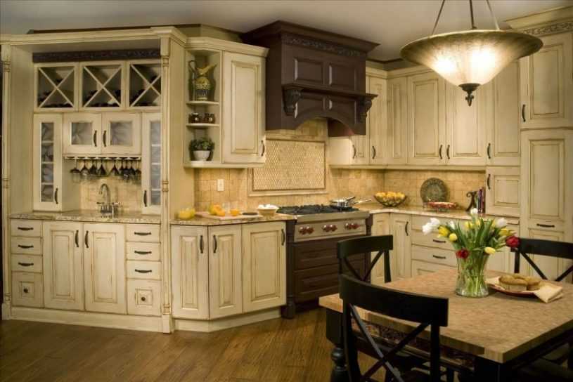Часто для обстановки кухни используют старинные бабушкины столы и стулья: их чинят, обрабатывают и дарят им новую жизнь. На фото кухонь под старину часто можно увидеть присутствие массивного буфета, который также считается подходящим элементом для данного стиля. Конечно, в условиях небольшого помещения установить массивный шкаф с открытыми полками невозможно