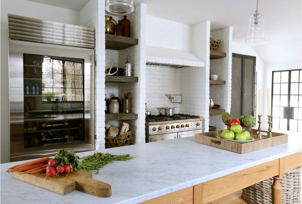 Филенка и стеклянные вставки, резные элементы, плетеный и кованый декор – все варианты оформления фасадов отлично подходят для стиля французского кантри. В качестве альтернативы верхнему ярусу кухонных шкафов (иногда частично) могут послужить открытые полки. Именно на них можно будет выставить особенно любимую посуду, баночки со специями и прочие кухонные аксессуары, которые необходимо держать «под рукой».