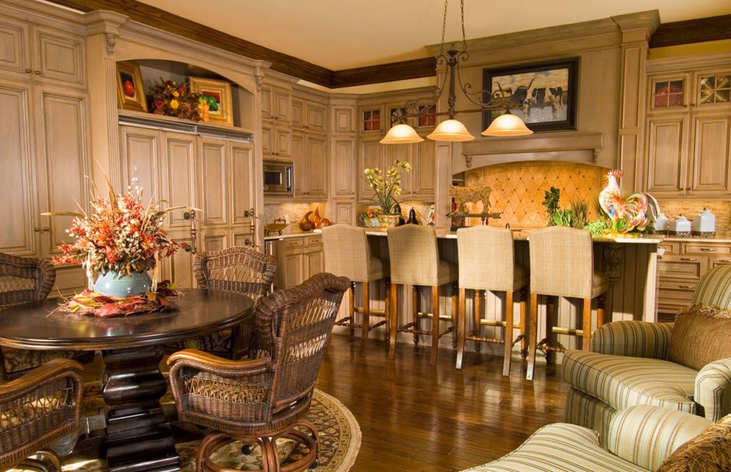Смешение деревянных предметов мебели с различной отделкой и кованых деталей придают интерьеру нотку старины. Здесь уместны и обеденные столы на резных ножках, и деревенские табуреты с сиденьями на завязочках, и плетеные кресла с подлокотниками.