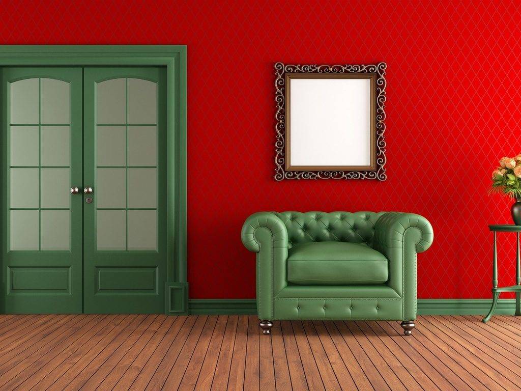 Зелёные межкомнатные двери в композиции с красными стенами уже давно стали классикой. Приём отлично подходит для комнат с низкими потолками и несколькими дверьми, расположенными на равном расстоянии.