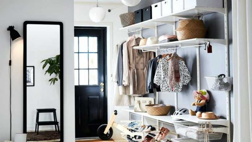 Существуют комплексные решения, совмещающие различные предметы мебели. Это может быть вешалка для одежды с одной или несколькими полками с головными уборами или корзинами-органайзерами.