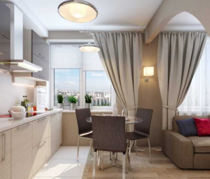 Для большой кухни подойдет практически любая ткань, а вот для маленькой комнаты важно подобрать материю, которая зрительно расширит границы. Сюда лучше выбрать светлый, летящий тюль