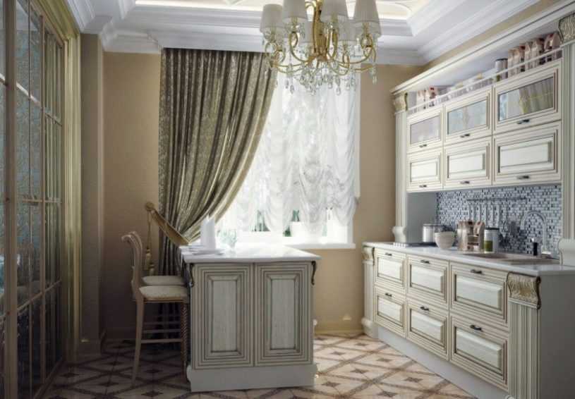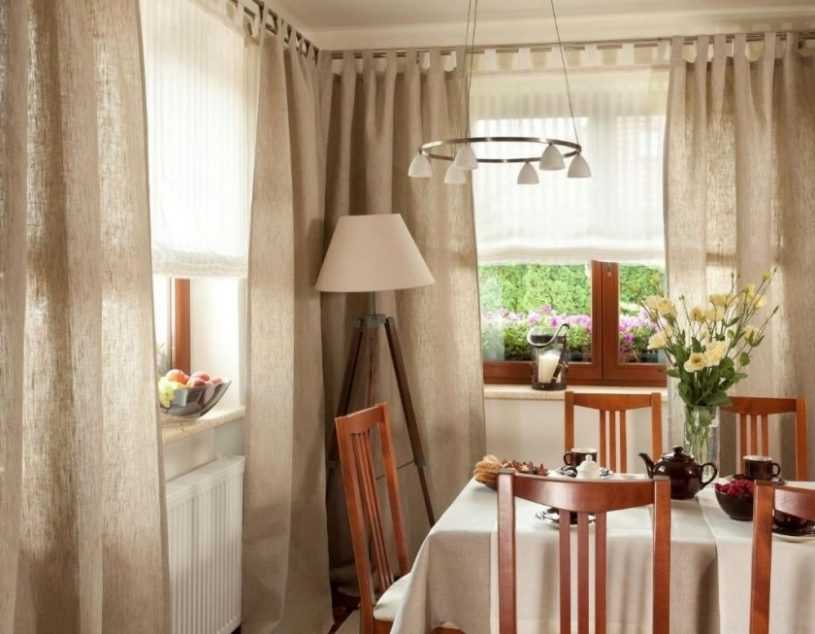 Такое решение идеально для просторной кухни-столовой, с большими высокими окнами. При этом нужно иметь в виду, что в обильных складках быстро скапливается пыль и испарения, поэтому кухня с такими шторами обязательно должна быть оснащена вытяжкой.
