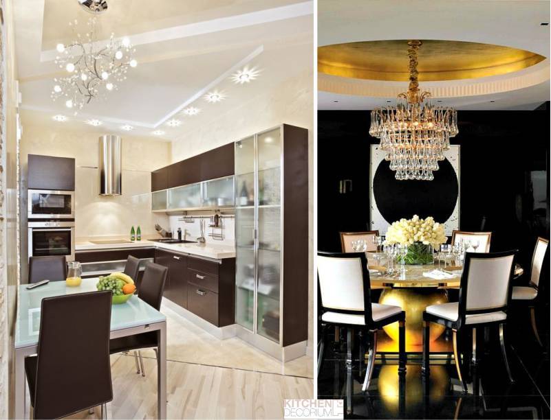 В одном из этих видов оформления, потолки, для большей индивидуальности кухни оборудованы подсветкой, которая добавляет индивидуальности и увеличивает количество света, которого в таком помещении не бывает слишком много.