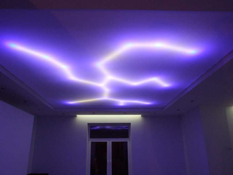 Такое освещение комнаты будет весьма интересным вариантом, но, как правило, таким устройством лучше воспользоваться, чтобы подчеркнуть какие-то особенные контуры, так как большого количества света такой шнур не даст. В нашем случае нужно добиться максимального уровня освещённости не только для красоты, но и для пользы, поэтому пойдём дальше.