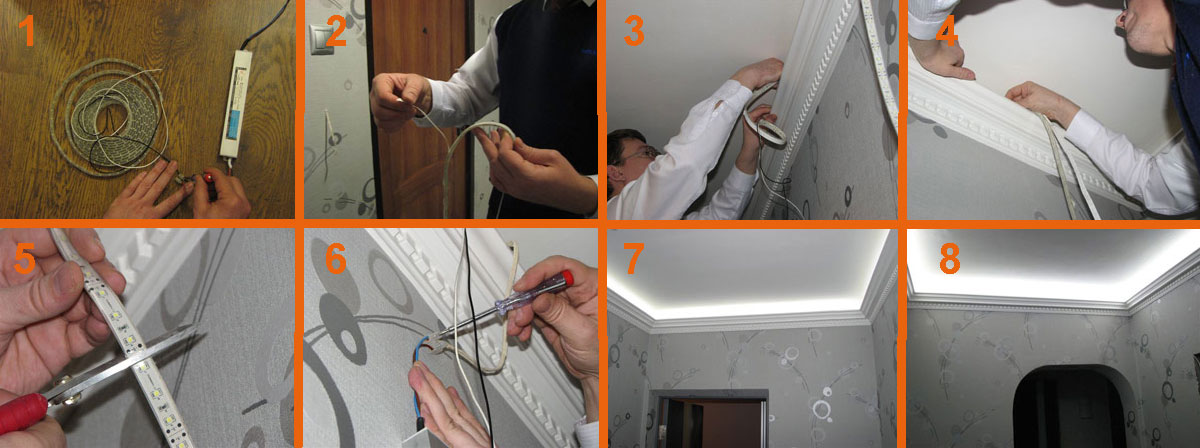 Монтаж светодиодного освещения выполняют пошагово. Перед тем как установить диодную ленту, замеряют площадь освещения, далее закупают товар. Один блок питания рассчитан на 14 м ленты. Провода, расположенные между отрезками, припаивают, ставят наконечники. Для изоляции проводов используют термоусадочную трубку.