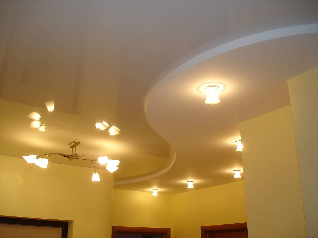 Потолочное пространство, зашитое гипсокартонными элементами, можно декорировать по своему вкусу: дополнять светильниками, красить, расписывать. Благодаря тому, что листы гнутся, несложно сделать фигурный потолок, например, с нишей в центре или бордюром по периметру.