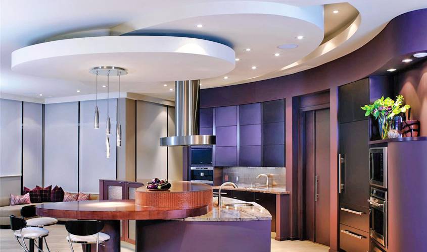 Для отделки рекомендуется выбирать светлые оттенки, которые на несколько тонов светлее стен. Избегайте рисунков, узоров или линий, которые создают границы потолка, уменьшая его и кухню в размерах. Действуя по принципу «чем меньше — тем лучше», вы сможете воспользоваться всеми достоинствами сооружений из ГКЛ и преобразить интерьер.