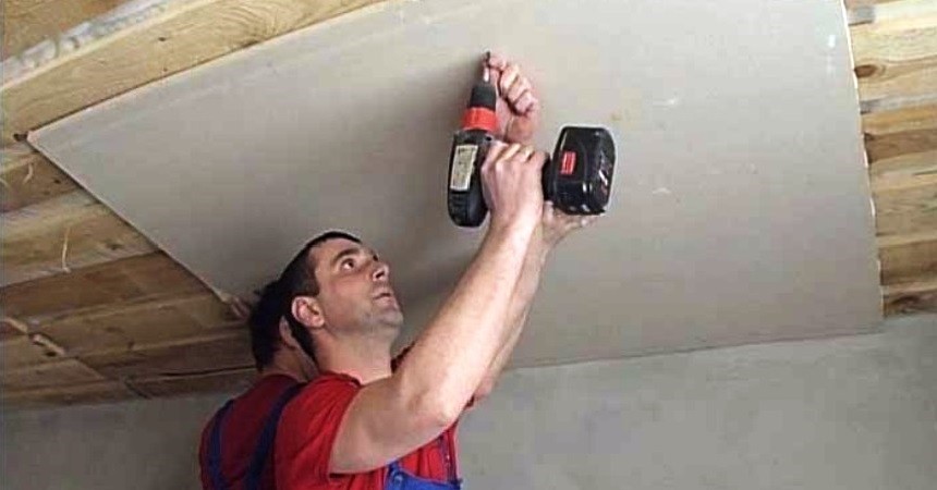 - Теперь крепите потолочный ГКЛ таким образом, чтобы места соединения смежных листов попадали на брус.