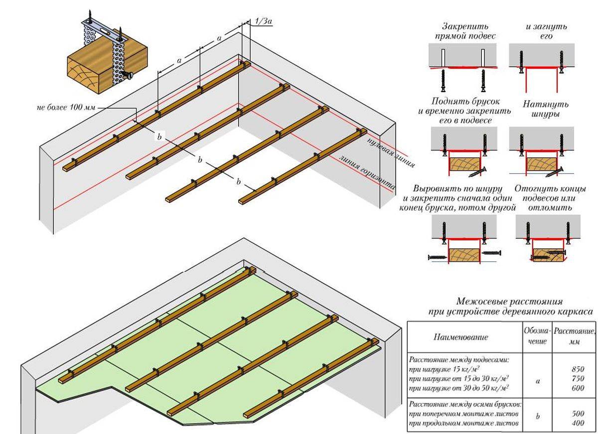 Схематичное изображение каркаса из дерева для гипсокартона на подвесах