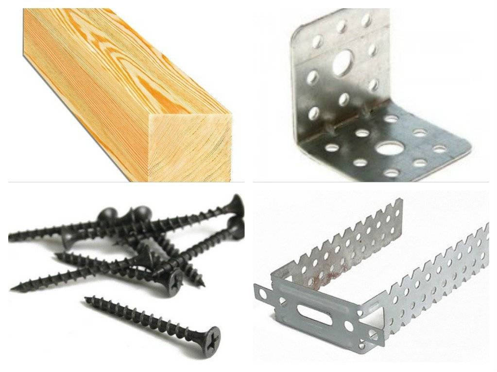 - К потолочным балкам с шагом 60 см прикручиваем подвесы. Каждый элемент закрепляем двумя саморезами длиной по 45 мм.